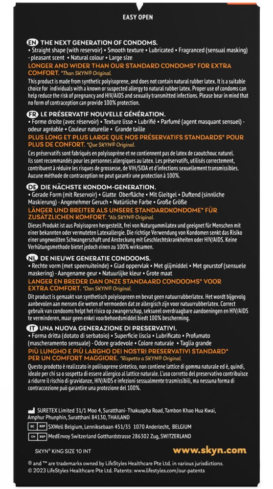Manix SKYN King Size condoms, made of Skynfeel™ polyisoprene — transparent, lubricated and with a reservoir — offer a generous size and great elasticity, for safe pleasure.