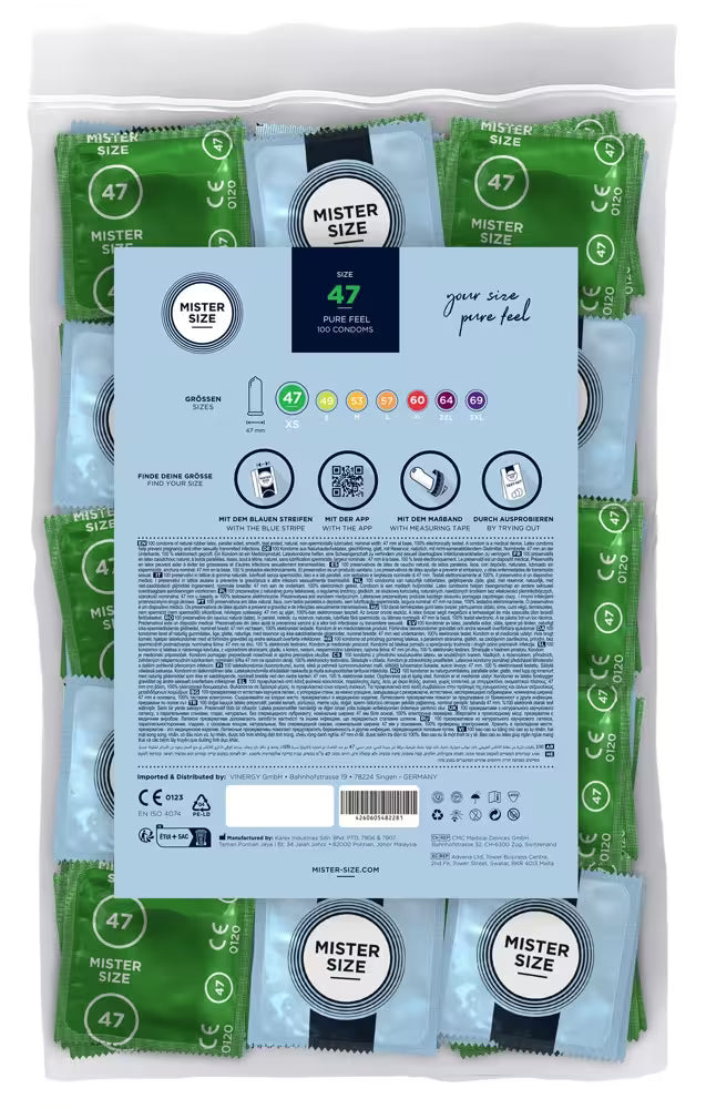 MISTER SIZE 47mm condoms are transparent, very thin, and lubricated with a reservoir tip, designed for a precise fit that maximizes comfort and sensation. The sizing chart on the packaging helps you easily choose the right size. Vegan.