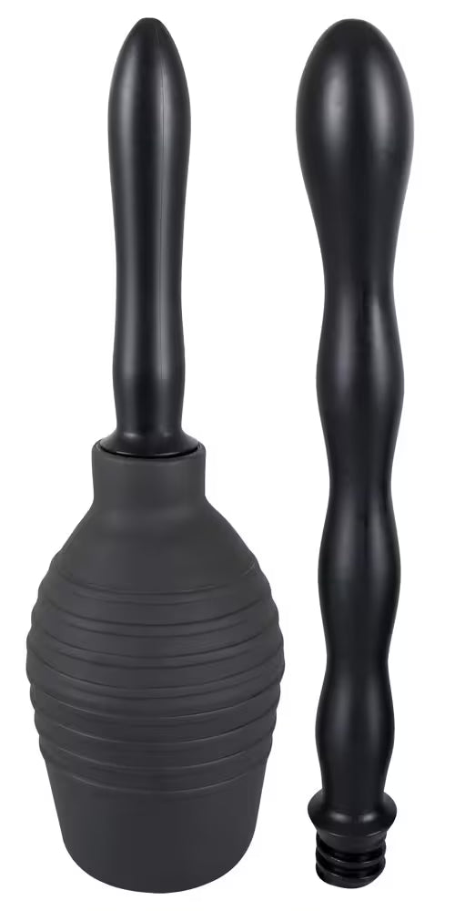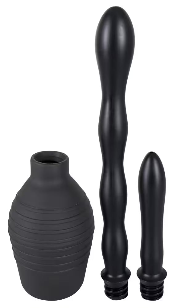 Black flexible bottle (300 ml) + 2 screw-on spray nozzle tips: one long corrugated for deep reach, one short smooth for gentle insertion.